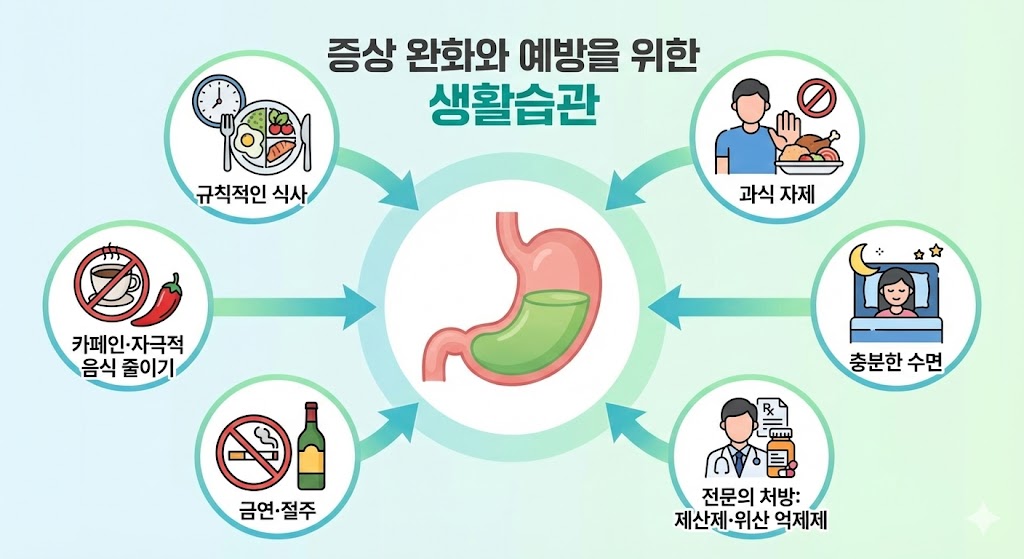 규칙적인 식사, 과식 자제, 카페인·자극적 음식 줄이기, 충분한 수면은 가장 기본적인 개선 전략입니다. 금연·절주는 위 점막 회복에 큰 도움을 주며, 필요 시 전문의 처방으로 제산제·위산 억제제를 사용할 수 있습니다.