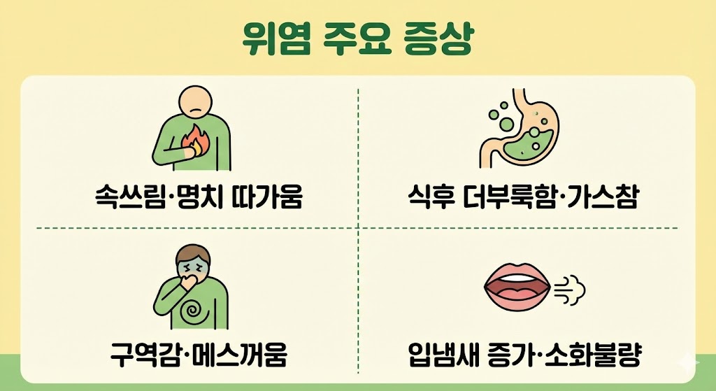 위염은 급성·만성 형태로 나뉘며 일상 속 피로, 과식, 불규칙한 식사로 쉽게 악화됩니다. 다음은 대표적인 위염의 신호입니다.