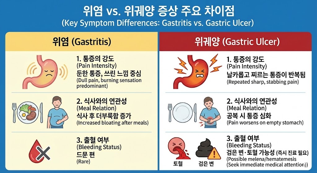 위염은 위 점막이 단순히 붓고 자극받는 상태이며, 위궤양은 점막이 깊게 파여 ‘상처’가 난 것입니다. 따라서 위염 증상과 위궤양 증상은 유사하지만 통증의 강도와 지속성에서 차이가 발생합니다. 두 질환 모두 지속되면 위출혈 등 합병증으로 이어질 수 있어 조기 관리가 중요합니다.