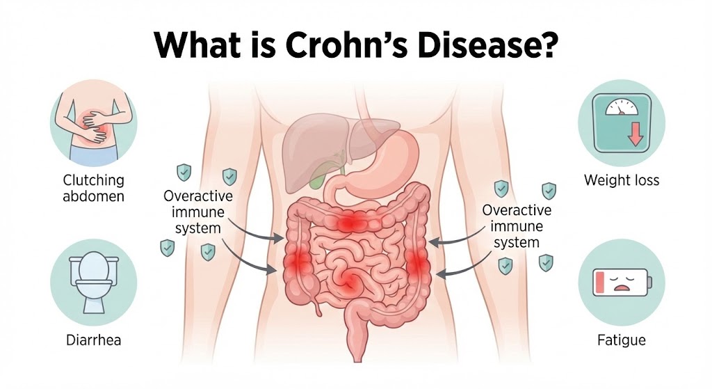 크론병은 면역계가 장을 과도하게 공격하면서 염증이 지속되는 자가면역성 질환입니다. 복통, 설사, 체중 감소, 피로 등이 흔하며, 재발과 호전이 반복되는 특성이 있습니다. 유전적 요인·장내 미생물 불균형·환경 요인이 복합적으로 작용하는 것으로 알려져 있습니다.